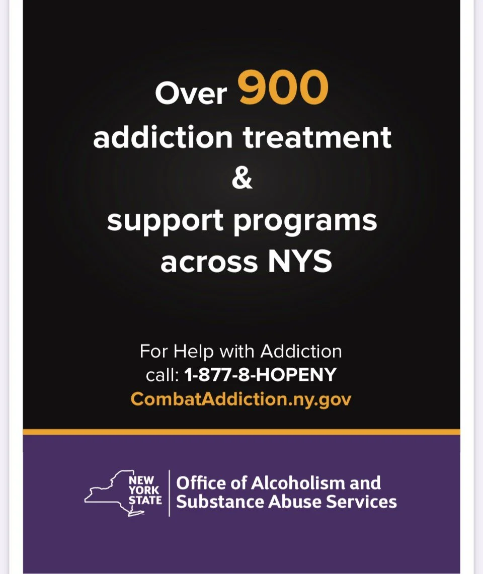 Help and treatment are always available. If you or someone you love are struggling, call the NYS OASAS HOPEline, at any time of the day or night, 365 days a year at: 1-877-8-HOPENY (1-877-7369). or text 467369.